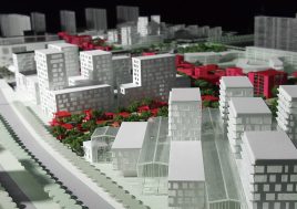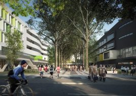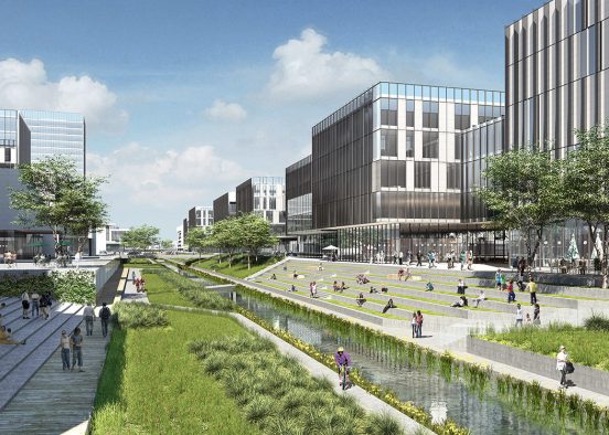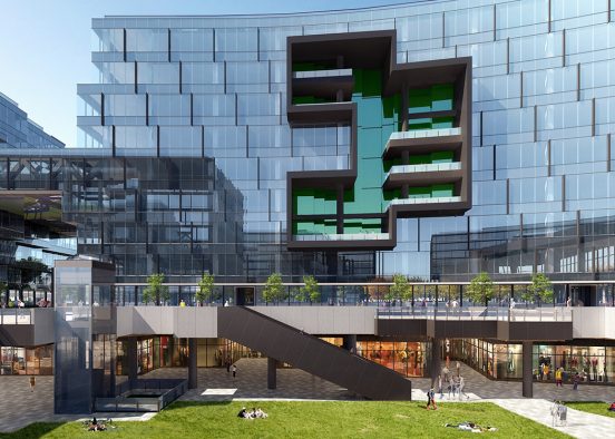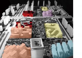The resulting six distinct urban districts have varying programs and are each connected to each other and to the surrounding district via this public open space. On the east of the site there is a lower density, human-scale retail and services area. Density and height increases towards the west where housing is the dominant program.